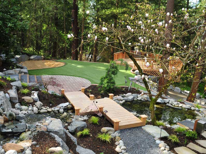 The concept showed the new layout with connected outdoor living spaces, quality artificial golf greens, the garden water feature and canyon overlook-deck. A new path and steps made access to the detached garage easy, and the greenhouse and garden area laid out nicely in the sunny area. The proposed plantings added color and texture. This plan helped us to estimate the cost of landscaping work. After the concept was finished, we got input from the Hales and made changes and finalized the plans.
